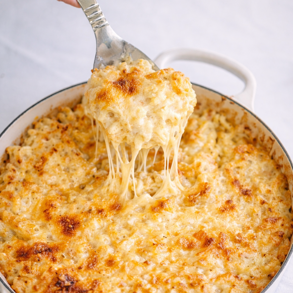 Macaroni pasta baked in a rich cheese sauce, topped with grated Cheddar cheese.